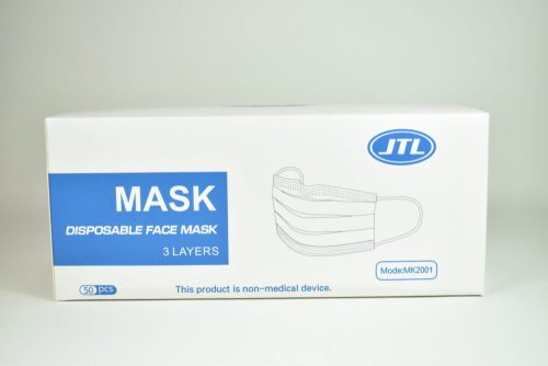 Three-layer medical face mask with a filter. Dimensions 17.5 cm × 9.5 cm. 20 g + 25 g + 25, CE, BFE 95%. Product conforms to standard EN14683. Box of 50 pcs, price for box €7.20. Case of 1,200 pcs. Minimum quantity 50 pcs.