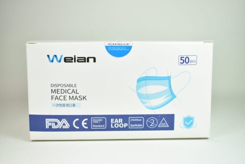 Three-layer face mask. Product conforms to standard EN 149:2001+A1:2009. Box of 50 pcs, price for box €4.80. Case of 2,000 pcs. Minimum quantity 50 pcs.